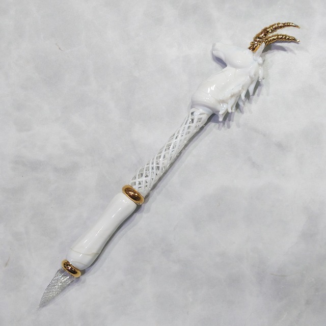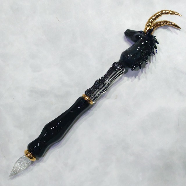 It is a shaped glass pen decorated with the heads of bicorns, which are mythical creatures like unicorns. The marble-like texture is combined with gold paint to create a classy piece. The cross section of the grip is octagonal and the lace line is straight in Gothic style. Lengh about 21cm ユニコーンと並ぶ神話の生物バイコーンの頭を飾りに付けた造形ガラスペンです。 大理石調のテクスチャに金彩を組み合わせ、高級感のある作品に仕上げました。 グリップの断面は八角形でレースラインはストレートラインにしてゴシック様式になっています。 長さ約21cm