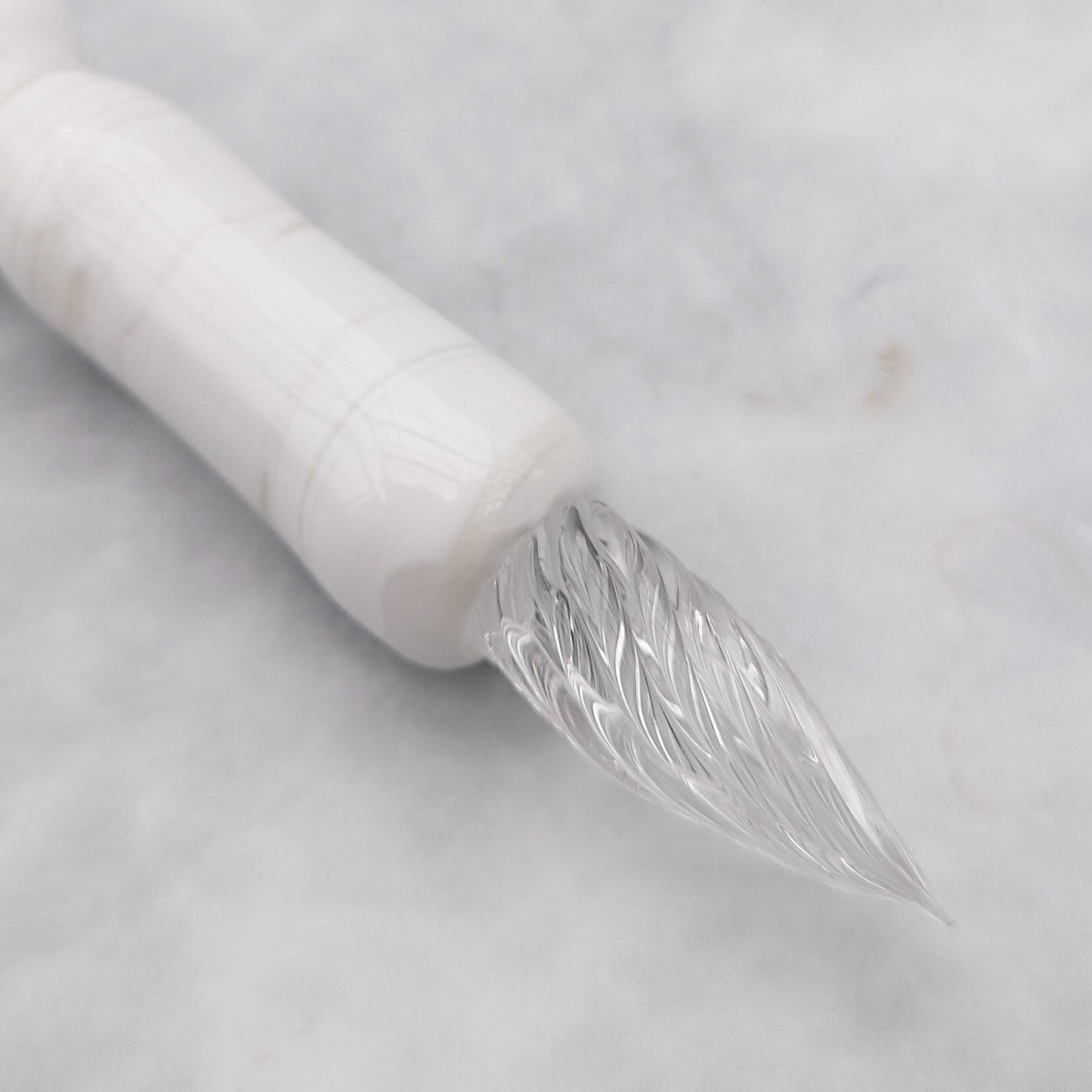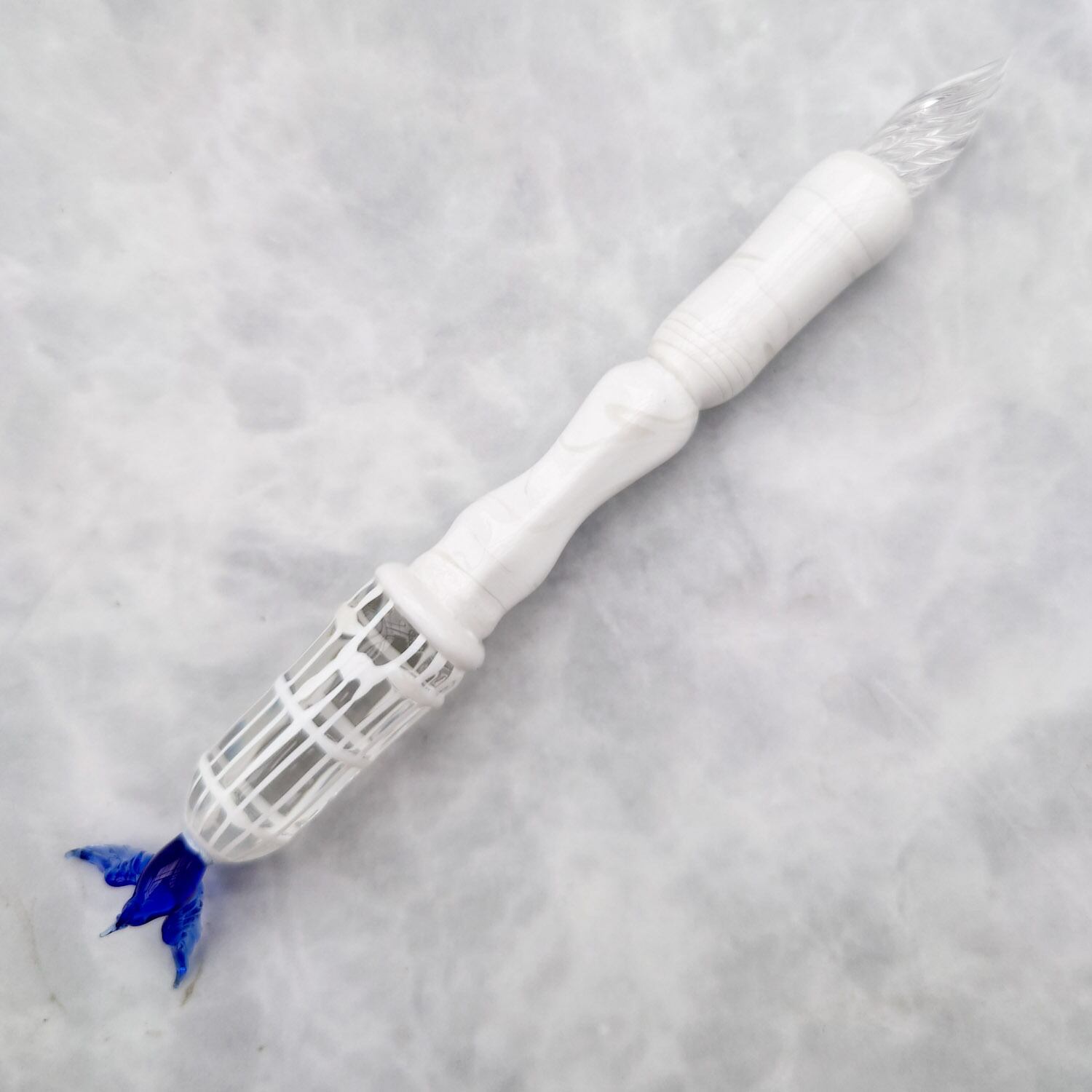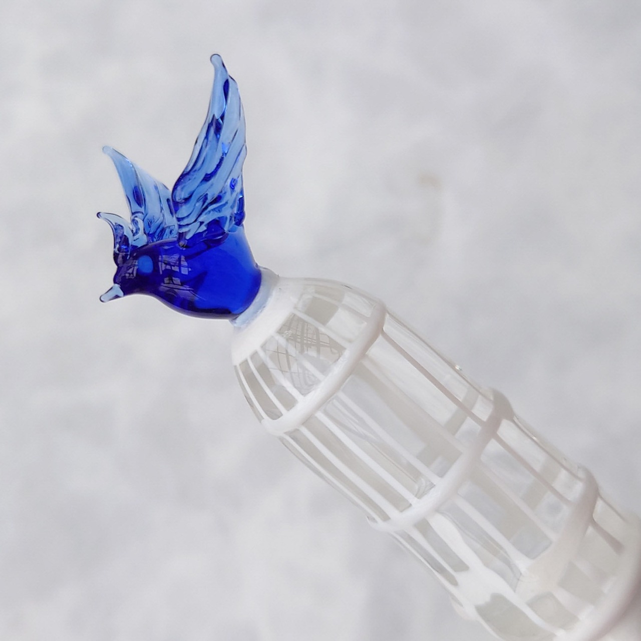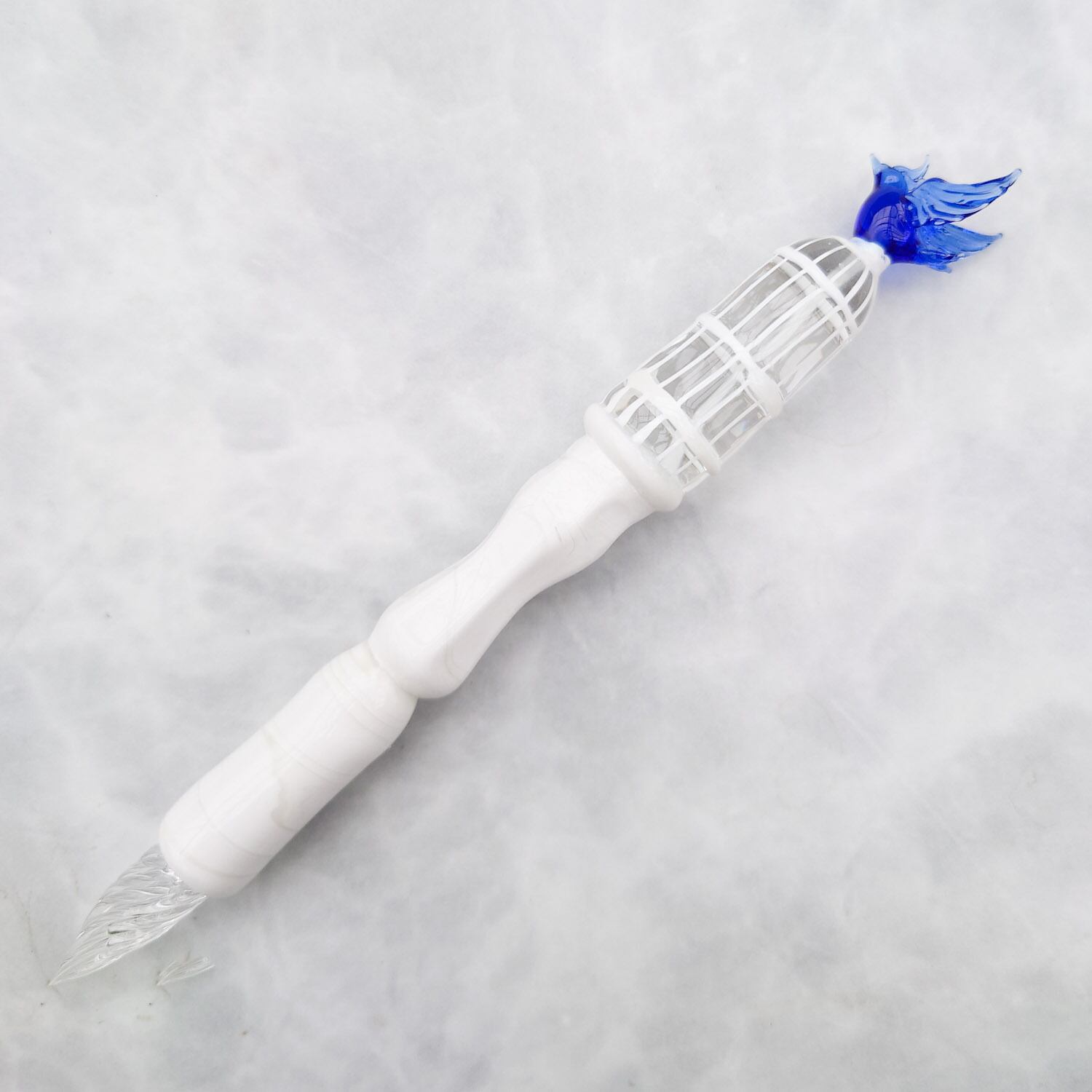 Glass pen decorated with a white cage and a small blue bird flapping its wings with freedom on a heavy marble-like pen shaft.