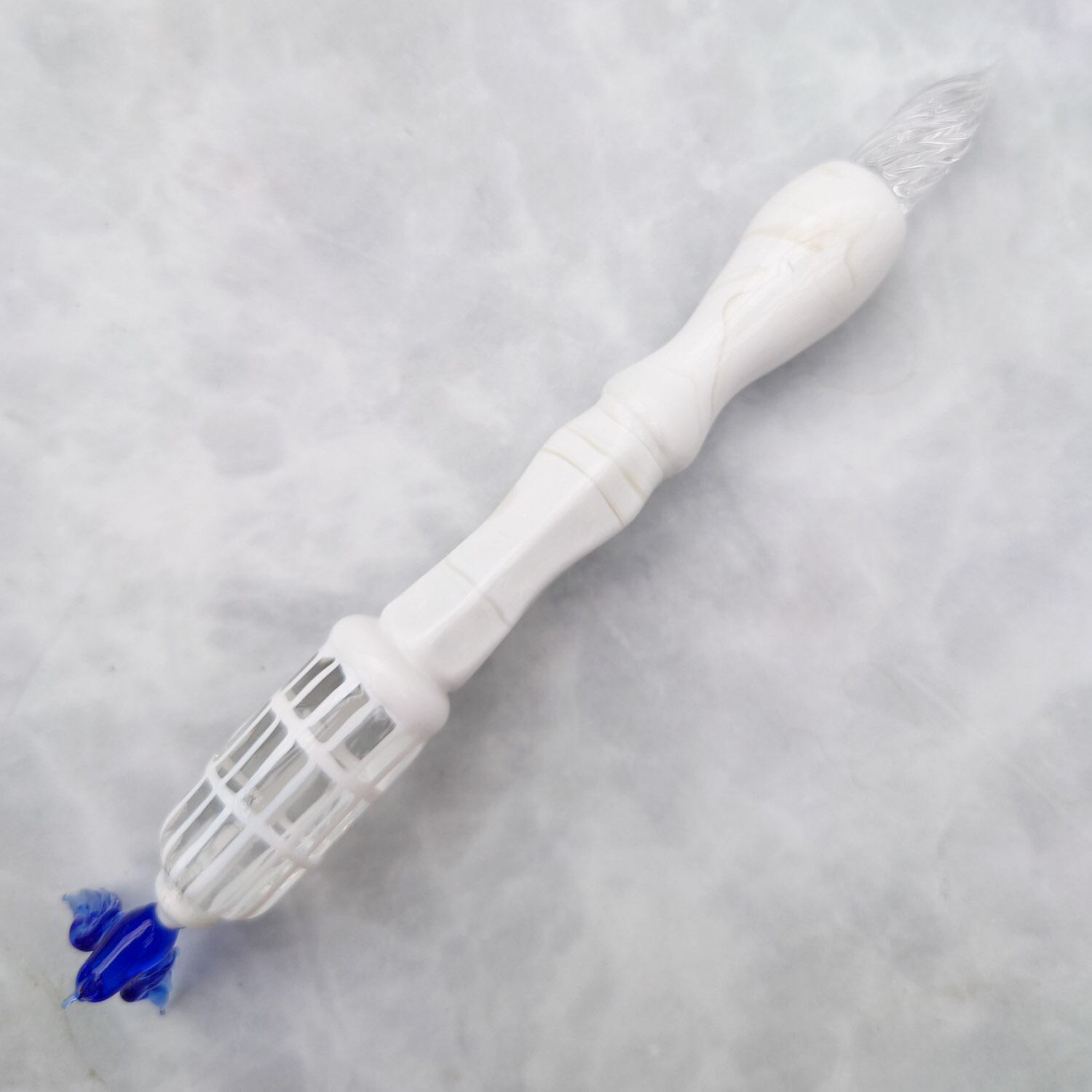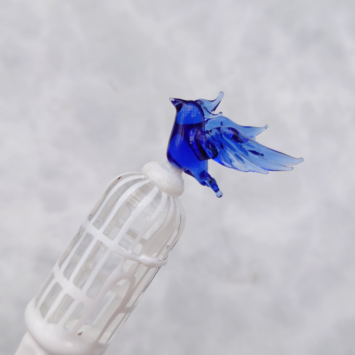Glass pen decorated with a white cage and a small blue bird flapping its wings with freedom on a heavy marble-like pen shaft.