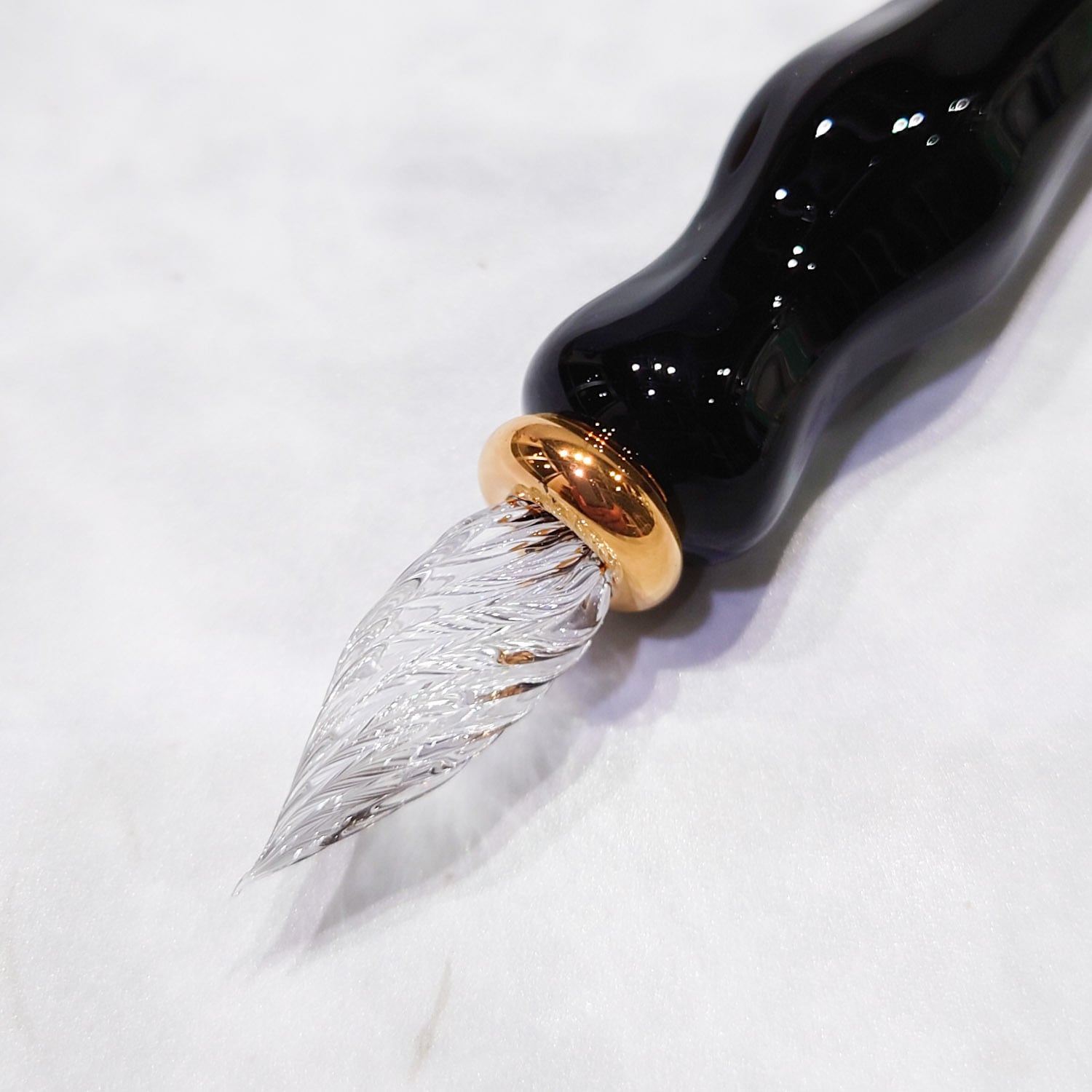 It is a shaped glass pen decorated with the heads of bicorns, which are mythical creatures like unicorns.