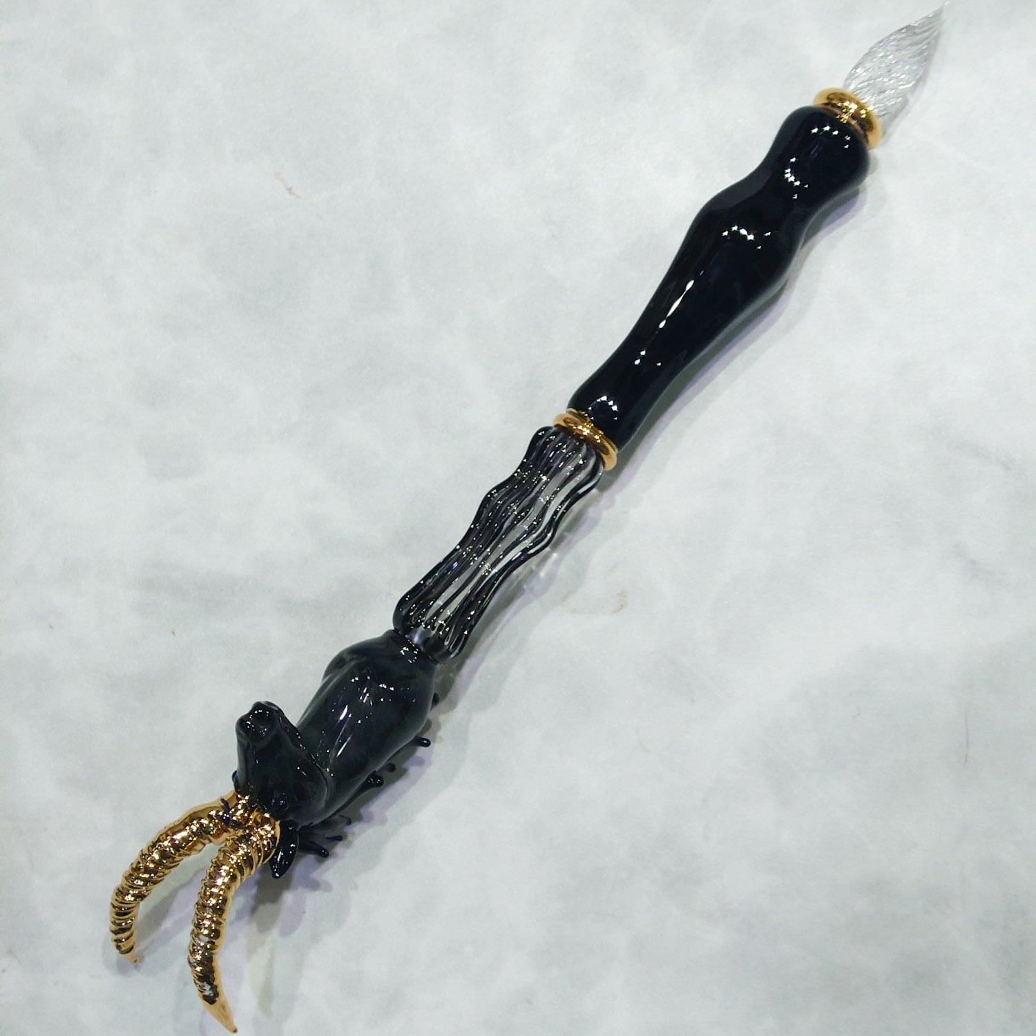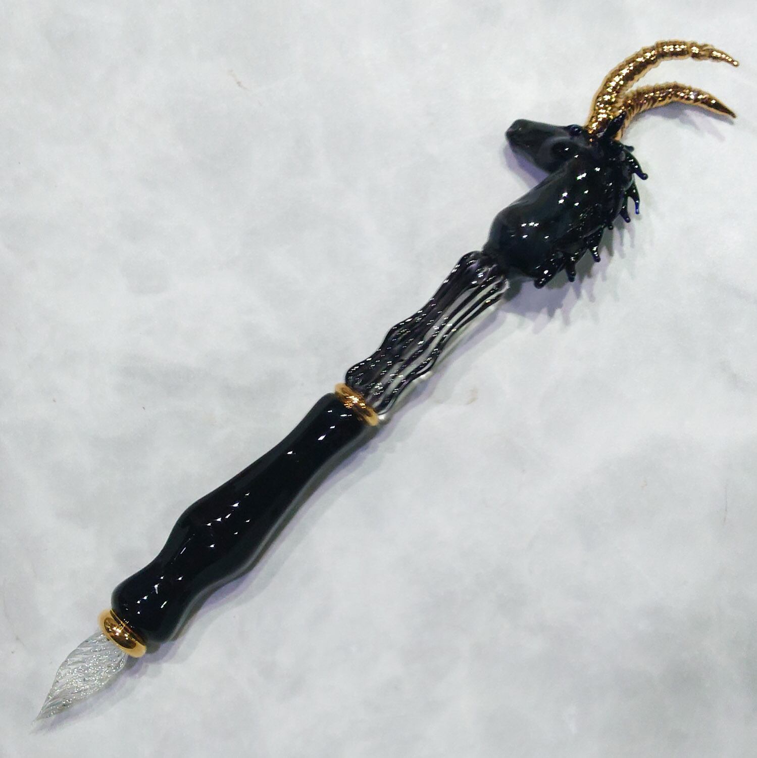 ユニコーンと並ぶ神話の生物バイコーンの頭を飾りに付けた造形ガラスペンです。