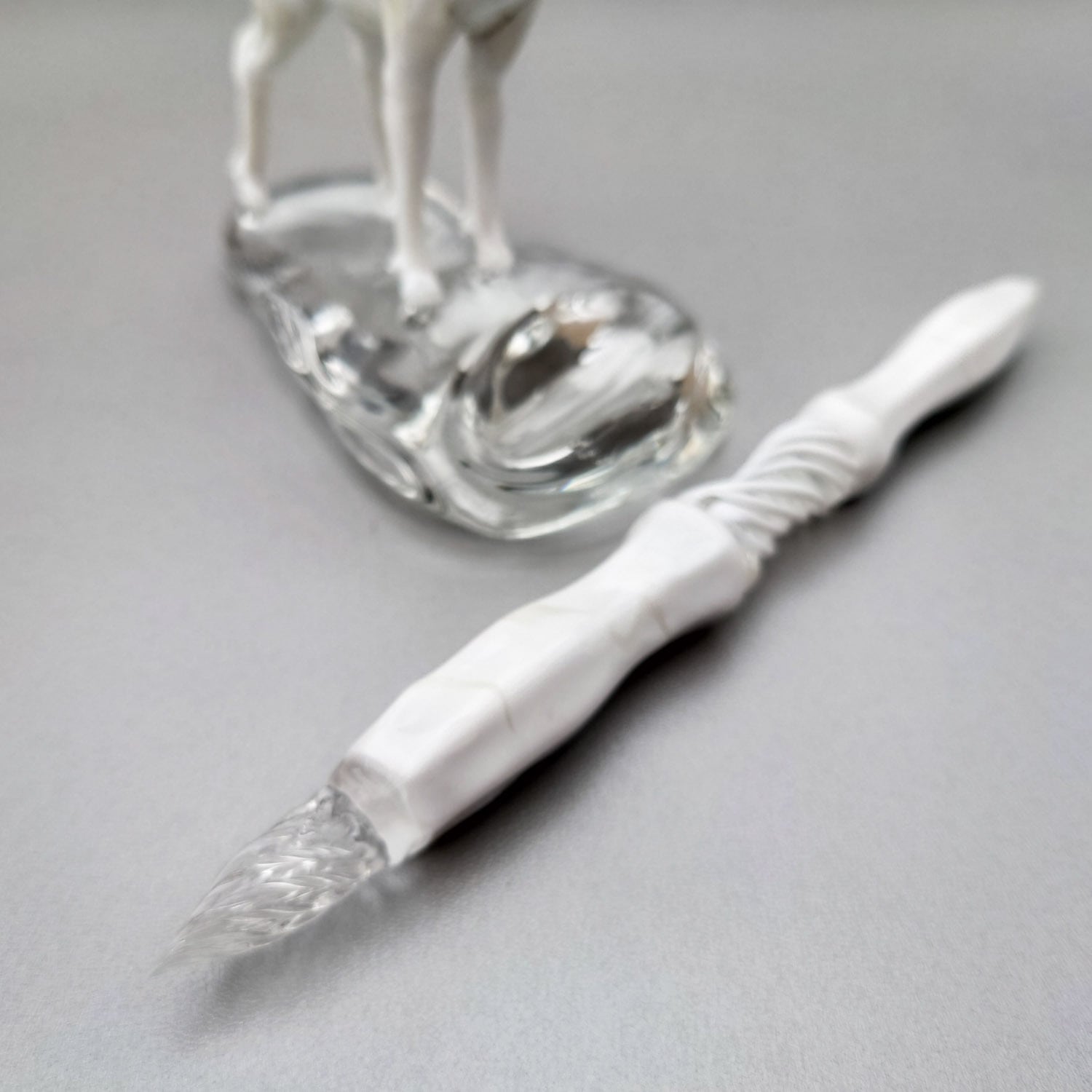 この「Gigant dear pen rest」は、ペーパーウェイトとしての機能はもちろん、書くことを楽しむためのアートとしてもお楽しみいただけます。大理石風のガラス彫像と同じ素材で作られた専用ガラスペンが付属し、書くたびにその美しさに魅了されることでしょう。デスクに置くだけで、空間全体が一層華やかに演出されます。