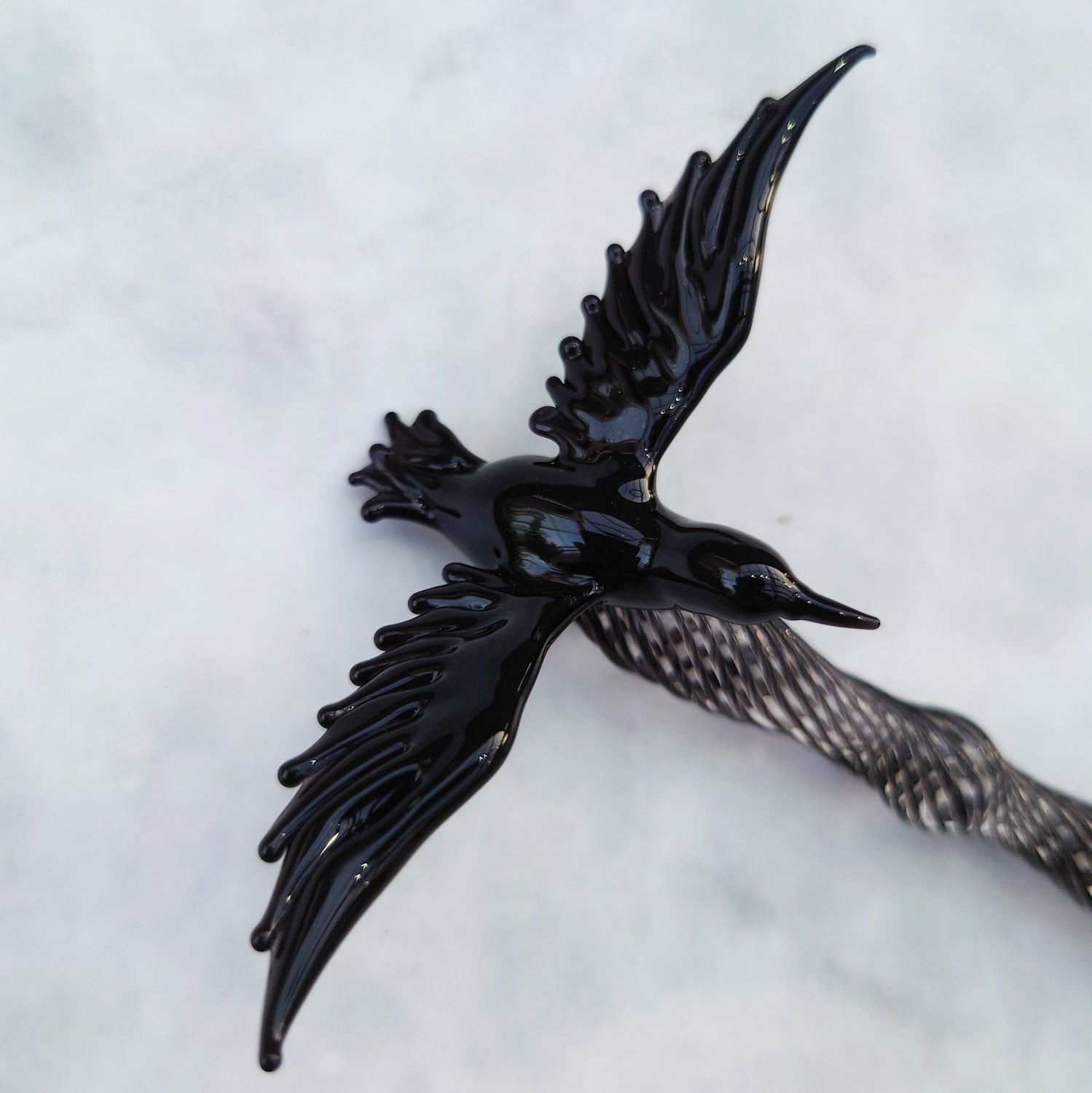 Crow Glass Pen A is a glass pen beautifully adorned with a black wing motif. Its intricate wing design is truly a sight to behold, and the pen barrel features a delicate black lace pattern spiraling across it. The elegant barrel is complemented by a nib that holds ink well, giving the pen an overall slim