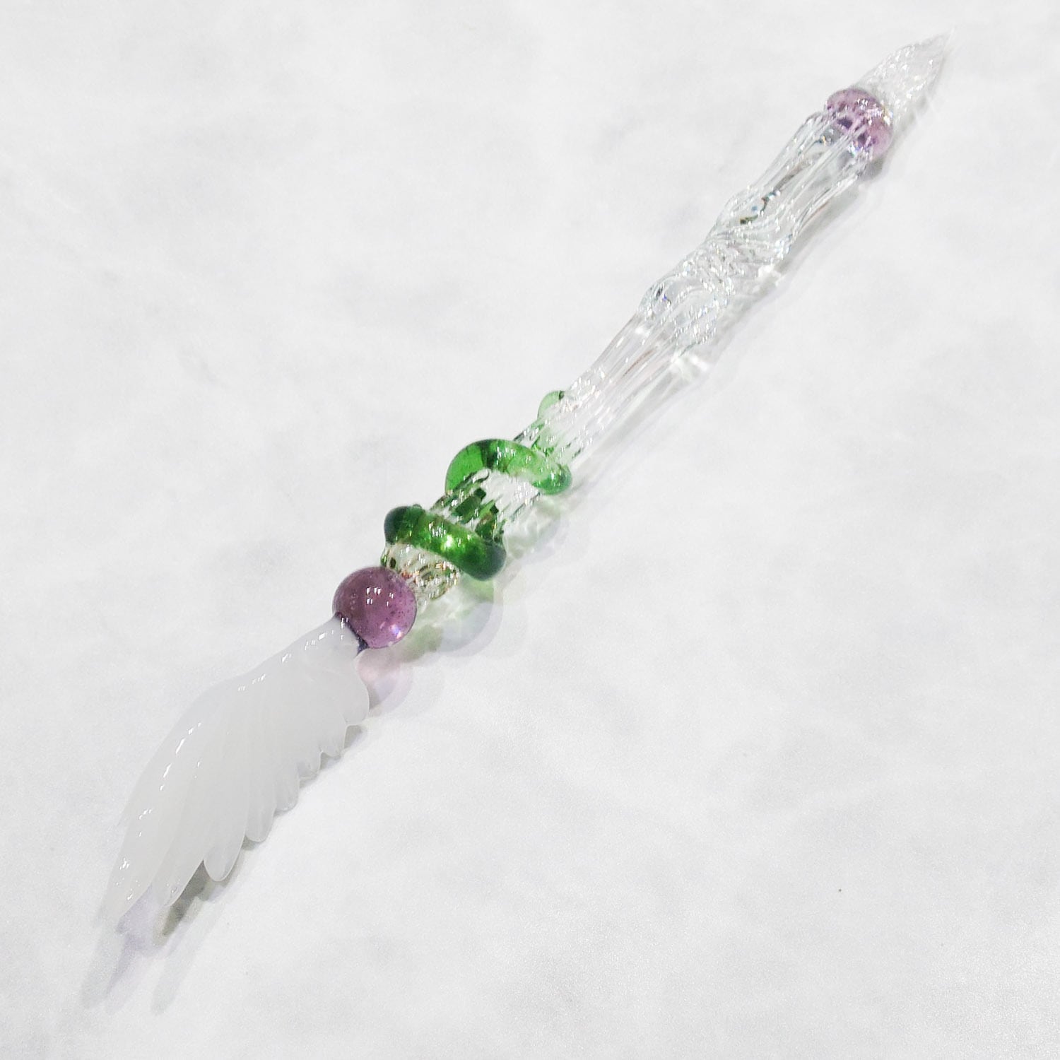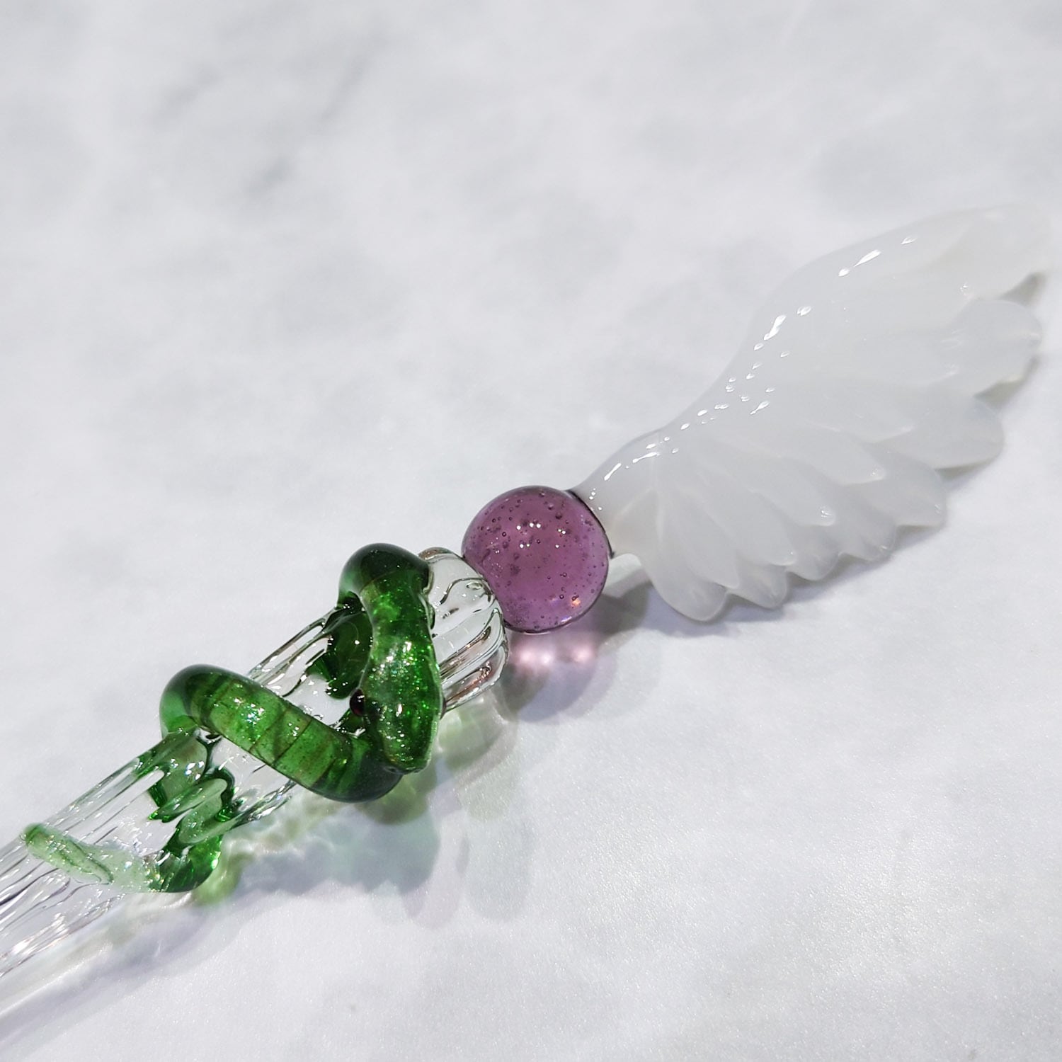 This product is a glass pen designed based on the staff, which features a snake and wings wrapped around it.